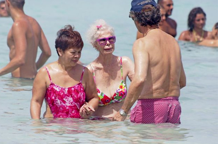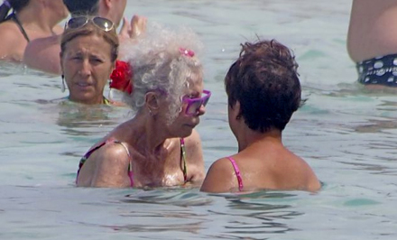 Med sin blomstrede bikini og mærkesolbriller faldt hun ind i strandbilledet som en glad bedstemor på sommerferie med familien, og ikke en af verdens mest velhavende kvinder, som ifølge Guinness Rekordbog har det største antal adelige titler i hele verden.