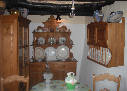På samme etage er et sidelokale indrettet som et landkøkken med vitrineskab, tallerkenholder og porcelæn.