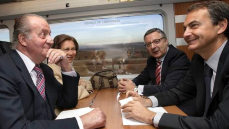 Ved ankomsten til Valencia: Til venstre José Luis Zapatero på talerstolen og til højre giver den folkekære Kong Juan Carlos Udviklingsminister, José Blanco, en odentlig krammer