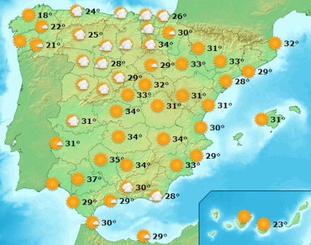 Madrid får i dag mellem 18 – 35 grader, Barcelona 21 – 33, Valencia 22 – 30 og Málaga 22 – 30.