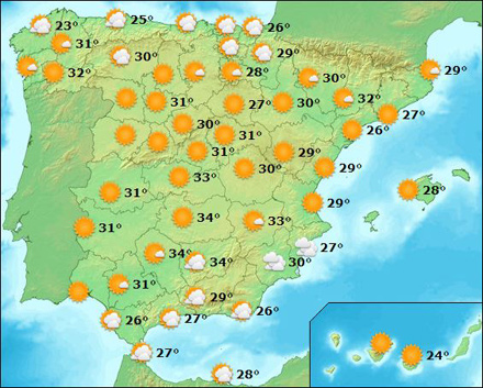 Madrid får i dag mellem 22 – 31 grader, Barcelona 20 – 31, Valencia 22 – 30 og Málaga 20 – 29.