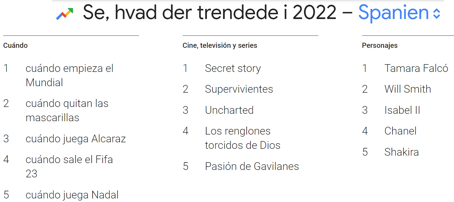 Går vi videre, kommer listen over 'hvornår', 'film, tv og serier' og 'personer', som både er lavet for Spanien og Danmark, hvor danskerlisten dog er 'spørgsmål' og ikke kun 'hvornår'. Vi starter med Spanien: