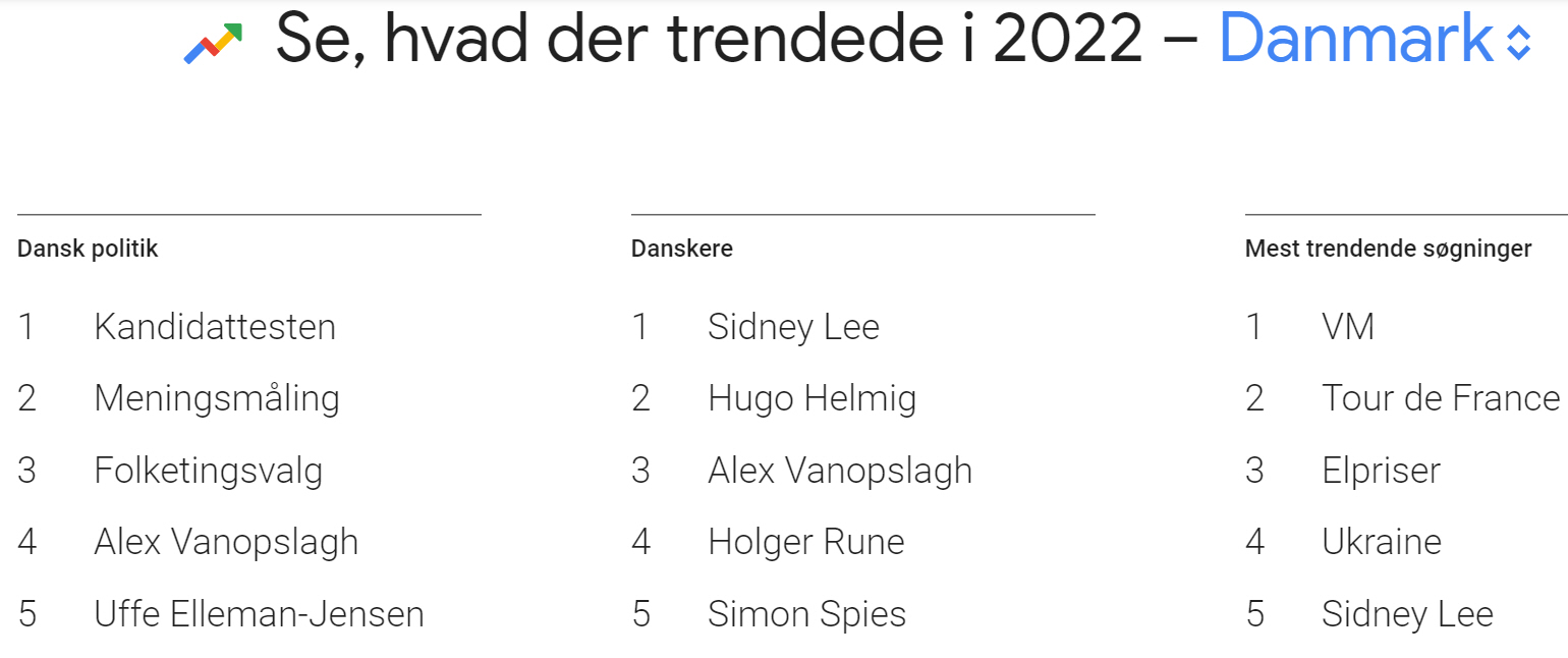 I Danmark er der blevet fokuseret på lidt andre sager... Her fremhæver Google søgninger på 'dansk politik', 'danskere' og 'mest trendede søgninger'. Den sidstnævnte svarer til 'general' i den spanske, så lad os starte med den.