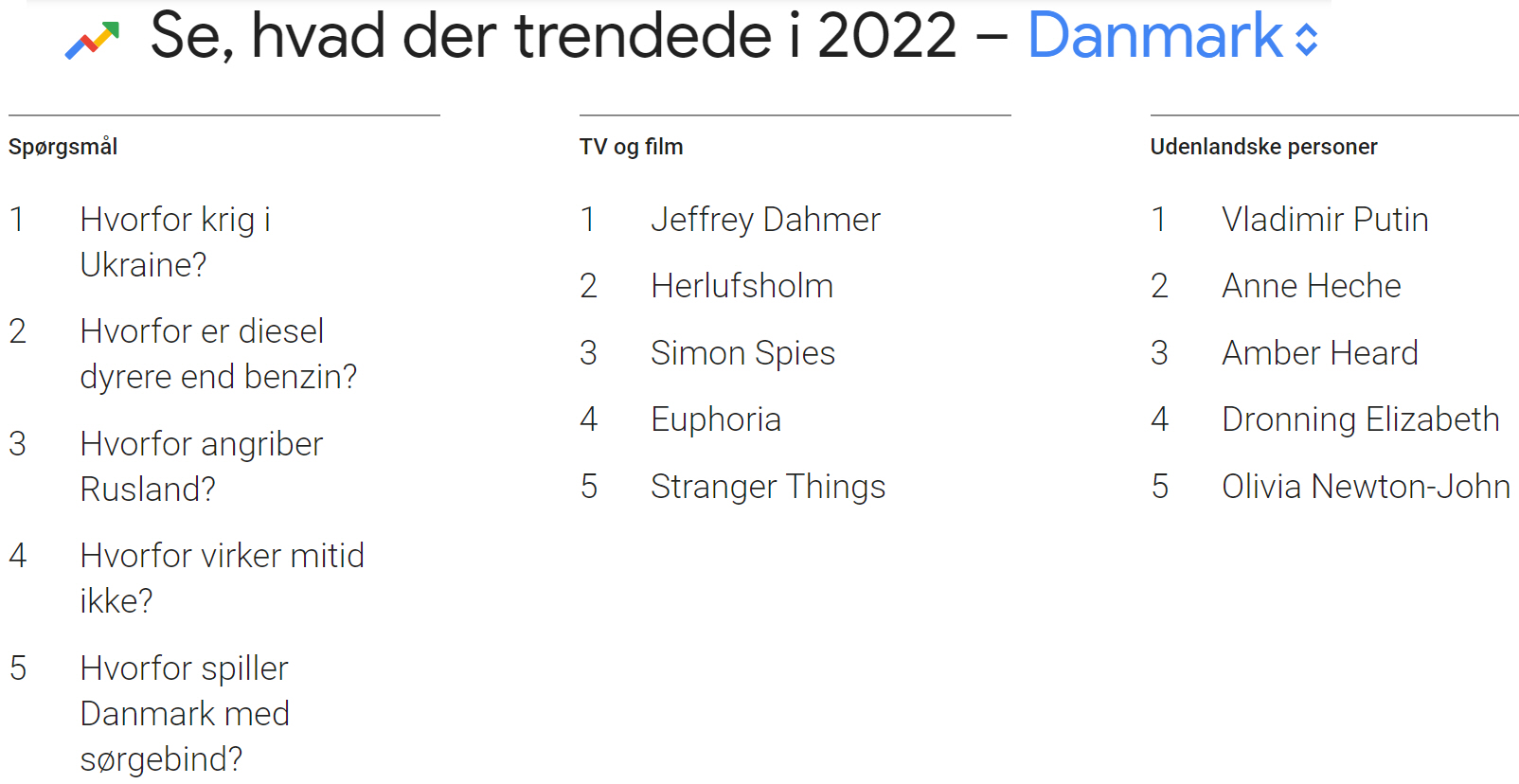 I toppen af den generelle søgning ligger spillet Wordle, herefter Ukraine, så to gange sport og så Rusland på femtepladsen. Under nyheder er Ukraine i toppen og herefter klimaforandring, abekopper, elprisen i dag og transport-strejke.