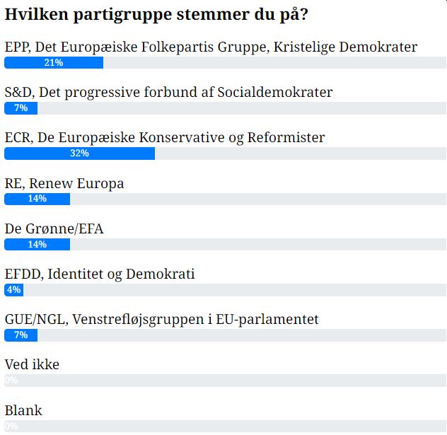 Forrige lørdag inviterede vi vores læsere til en meningsmåling om de politiske grupper i EU-Parlamentet, som de enkelte valgte MEP’ere slutter sig til, efter de er blevet valgt. Det er jo der, den reelle magt ligger.