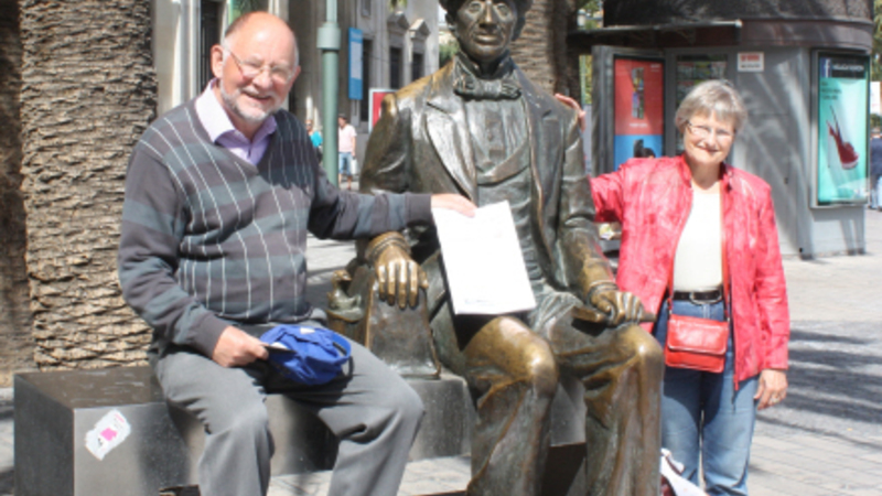 Han fortalte også, at han sad dejligt her på Alamedaen med den friske luft fra havnen og tæt på det hotel, han boede på, hvor en nydelig kelner serverede bayersk øl. På Alamedaen kommer der mange smukke spanierinder forbi, og nu kommer der også mange turister fra krydstogtskibe. Han var utrolit glad for, at så mange kom forbi og satte sig på bænken og fik en snak. Han var også meget imponeret over, hvordan fotografiets kunst havde udviklet sig.