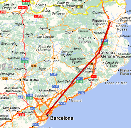 Rejsen fra Figueres til Barcelona varer 57 minutter og fra Girona til Barcelona 37 minutter. Turen fra Girona til Madrid kan gøres på 3 timer og 30 minutter.