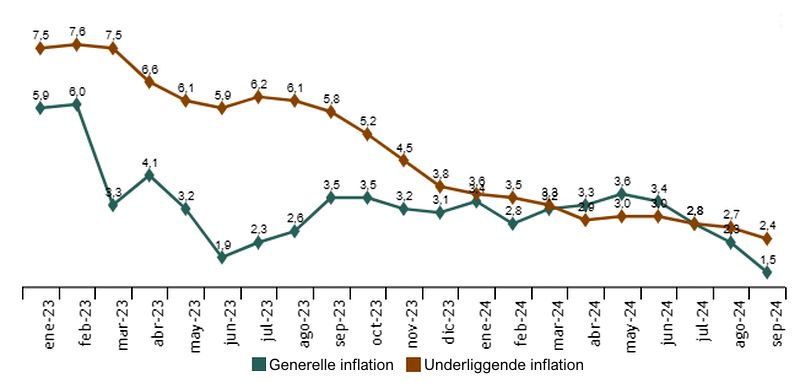Kerneinflationen er på sin side også faldet til 2,4 procent på årsbasis, hvilket er 0,3 procentpoint lavere end de 2,7 procent, der blev registreret i august. Denne indikator, som har ligget to måneder over det generelle indeks, udelukker prisen på energi og uforarbejdede fødevarer fra beregningen på grund af deres høje volatilitet. Dens nedtrapningshastighed er langsommere end det generelle indeks. Det underliggende forbrugerprisindeks har været faldende i tre måneder i træk, selvom nedtrapningen har været gradvis i løbet af det sidste halvandet år, siden det toppede med 7,6 procent i februar 2023.