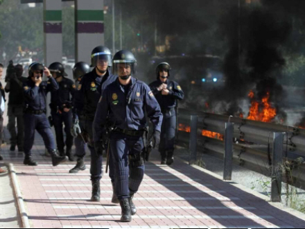 Aktivisterne spærrede Avenida Valle-Inclán for trafik ved at sætte ild til en række bildæk, som lå tværs hen over vejen.