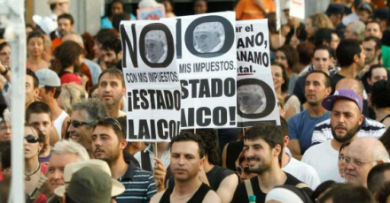 Der blev båret banner med teksten: ’Nul skatter til paven’ og ’Luk Vatikanet’ men der var også republikanske slogans og repræsentanter for 15-M bevægelsen Ægte Demokrati Nu. De kritiserer, at regeringen bruger indbyggerne skatte-penge på et besøg, der kun henvender sig til en begrænset del af befolkningen.