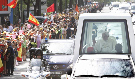 Pavens besøg i Madrid starter i dag. Hovedstaden er invaderet af over en million unge fra hele verden, der jubler. I nat var der voldelige sammenstød med demonstranter, der protesterer mod besøget. Læs også om Pavens bil og hans forskellige beklædninger...