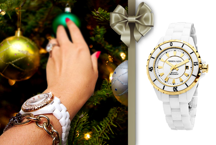 Stilet armbåndsur i hvid keramik med detaljer i guld. Uret er for den fashionable kvinde, der ønsker at understrege et klassisk men samtidig moderne look.