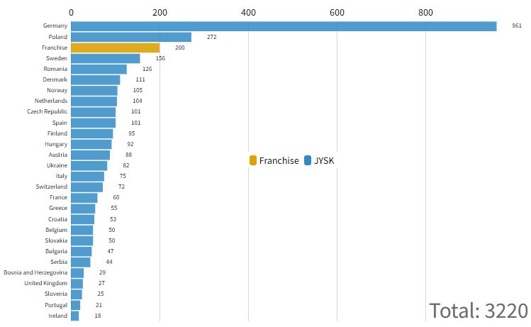 Lars Larsens eventyr startede i 1979 med JYSK Sengetøjslager i Aarhus, og i dag er koncernen vokset til over 3.220 butikker, hvoraf de 100 altså er i Spanien og de 21 i Portugal.