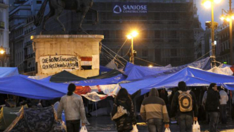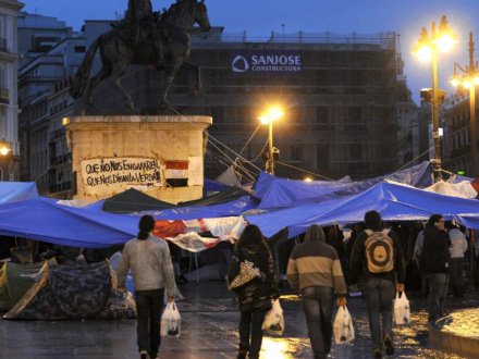 Omkring 20.000 demonstranter har i de seneste dage været forsamlet rundt omkring på pladser og torve i landets storbyer i protest mod den aktuelle økonomiske og politiske situation i Spanien. De kræver 'reelt demokrati' og herunder hører kampen for ytringsfrihed. I går blev de fleste manifestationer opløst, men omkring et par hundrede har dog valgt at trodse ordren fra politiet om at forlade pladserne, og overnattede igen i det fri – denne gang i silende regn. Demonstranterne på Puerto del Sol i Madrid forsøgte at holde varmen under store presenninger, imens de råbte: Det regner og regner, men vi flytter os ikke!