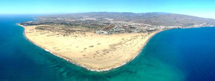 På den sydlige del af Gran Canaria finder du Maspalomas-fyrtårnet lige ved sandbankerne. Gran Canarias egen turistinformation beskriver stranden som endeløs, fordi sandet strækker sig langt ind på øen.