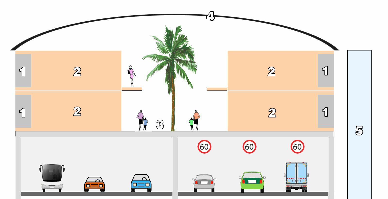 I område 1 er vejen 24 meter bred og overdækningen, der på vejen skaber en tunnel, kunne være 400 meter lang. I alt cirka 9.600 m2 i byggeareal. Ved opførelse i to etager vil det kunne give cirka 12.000 m2 i netto areal til boligerne. Ved en gennemsnitlig boligstørrelse på 45 m2, vil det give i alt cirka 250 boliger og et samlet befolkningstal på 500 ved en gennemsnitlig husstand på to personer.