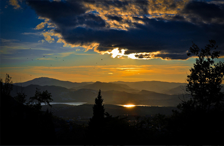 I en højde af 510 meter er udsigten forståeligt nok helt fantastisk, hvor man ser ud over nærliggende bakker, der er dækket af fyrretræer, vidtstrakte lunde med mandeltræer, vinranker og frugttræer.