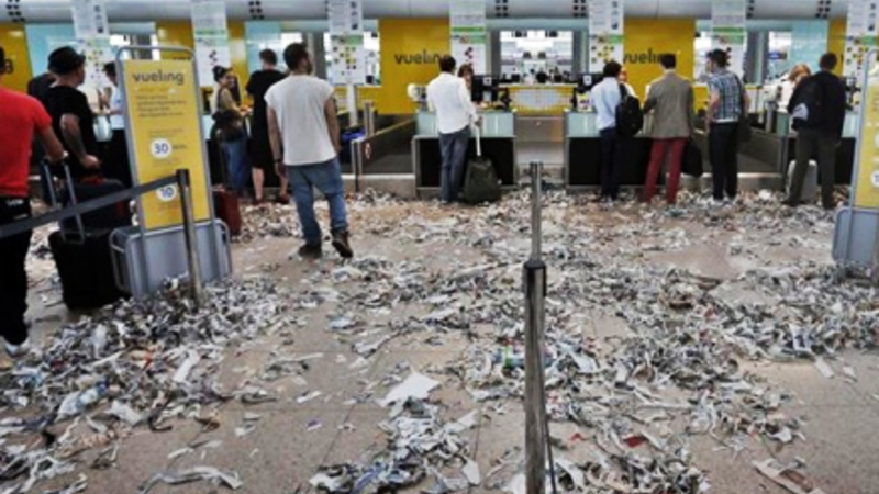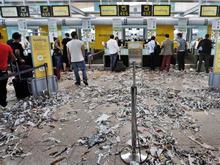 Rejsende bliver mere og mere vrede og aggressive, og fagforeningsmedlemmer, der er til stede i lufthavnen, har flere gange behov for assistance af det regionale politi, Los Mossos d'Esquadra.