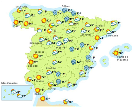 Madrid får i dag letskyet vejr og mellem 10 – 19 grader, Barcelona letskyet 13 – 21, Valencia vekslende skydække med byger og 16 – 22 grader, Málaga skyfrit og 15 – 22 grader.