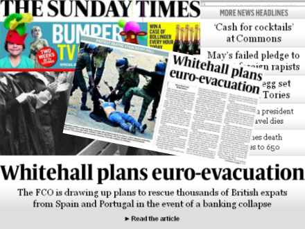 Det britiske udenrigsministerium er i gang med at udarbejde en nødplan for evakuering af britiske statsborgere i Portugal og Spanien, hvis det finansielle system i de to lande bryder sammen. Det skriver avisen Sunday Times.