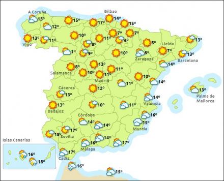 Madrid får i dag solrigt vejr med mellem minus en – 15 grader, Barcelona skyet og mellem seks – 14 grader, Valencia skyet og to – 13 grader og Málaga ligeså dog lidt lunere med mellem 12 – 20 grader.
