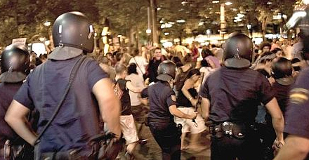 Den strategi gik i vasken. Næsten 1000 demonstranter fra M-15 bevægelsen havde i timerne forinden belejret pladsen foran ministeriet, efter at de havde gået i protest gennem Madrids hovedgade Gran Vía og forgæves forsøgte at nå frem til målet, Puerta del Sol.