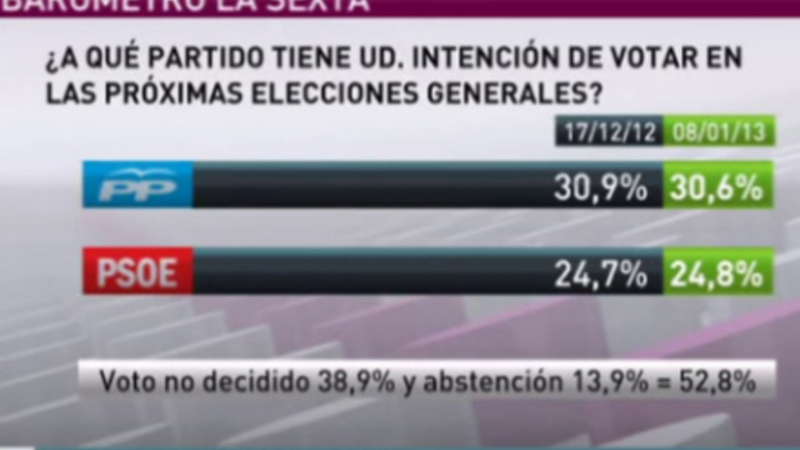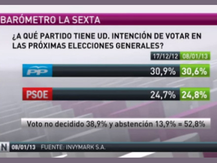 Den seneste måling afspejler stigende offentlig utilfredshed med det regerende parti. PP går 0,3 procentpoint ned i forhold til en måling den 17. december, som gav partiet 30,9 procent, mens PSOE kun går 0,1 procentpoint frem til 24,8 procent.