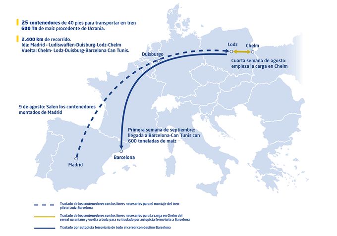 Her vil kornet blive overført til Renfe Mercancías-containere, som derefter vil blive overført til den terminal, der anvendes af Kombiverker-logistikruten i Lodz. Overførslen mellem Lodz og Chelm foretages af det polske jernbaneselskab DBP.