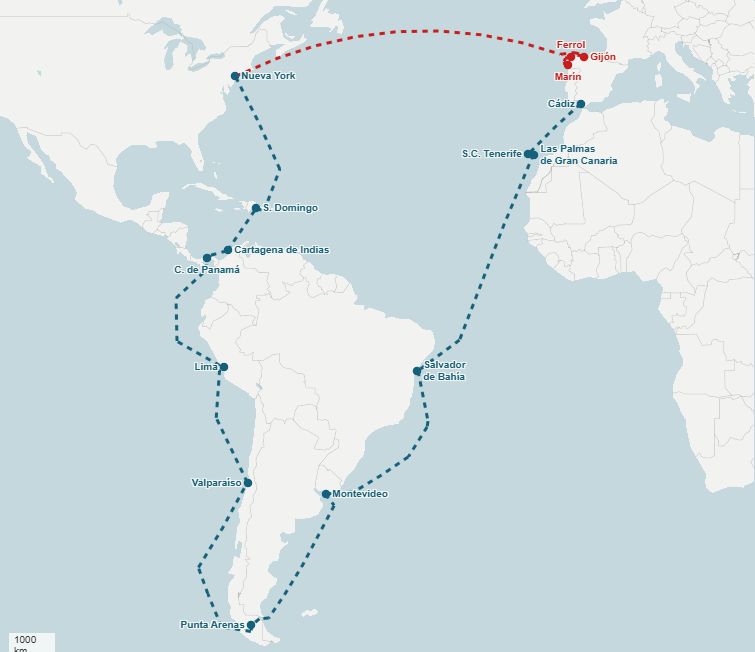 Efter at have fuldført sin rute gennem hispanoamerikanske lande er Leonor ankommet til New York, en by hun vil blive i indtil den 10. juni. Prinsessen vil forlade det amerikanske kontinent for at vende tilbage til Spanien med fly. Skibet vil fortsætte sin rejse over Atlanten, og Leonor vil genoptage aktiviteterne i Asturien og Galicien.