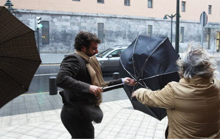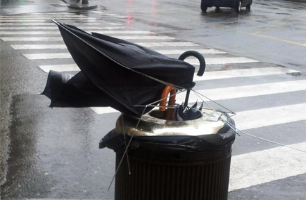 Sådan ender de fleste paraplyer deres dage, når der er orange beredskab