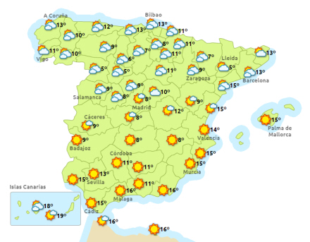 Dagtemperaturerne stiger i de østlige egne af fastlandet og på Balearerne. Ikke nogen nævneværdige ændringer i resten. Om natten er temperaturerne uændrede undtagen på Balearerne og i Levanten, hvor den falder en smule.
