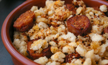 Fortsæt med 'Migas,' der er en typisk ret med ristede brødterninger, vand, pølser, mørbrad, serveret med druer, melon, vandmelon, appelsiner og oliven.