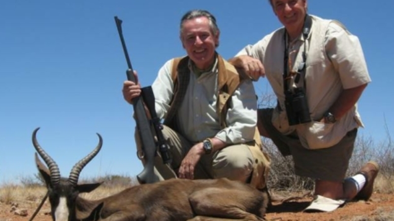 På et foto, som er publiceret af TV-stationen La Sexta, poserer Miguel Blesa smilende sammen med Carlos Vela med rifler i hænderne efter en jagt i Namibia, i november 2007.