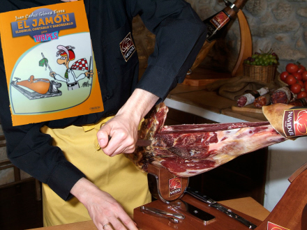 Under et skinke-skærer-arrangement i Málaga sponsoreret af Navidul, der er et af landets største skinkefirmaer, afslørede Gomez hemmelighederne bag, hvordan man skærer et stykke skinke af benet, uden at der ryger en luns hud med under det skarpe sværd.