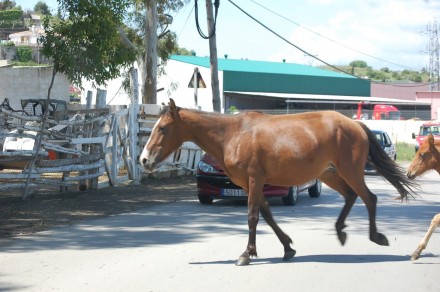 Der var forleden dag igen ved at ske en alvorlig trafikulykke, da to heste pludselig kom travende hen over vejen op til Cerros del Aguila.