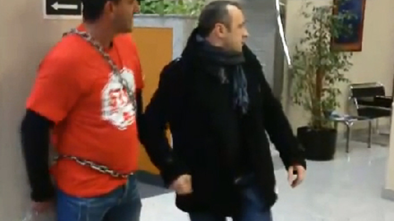 37-årig arbejdsløs gartner lænkede sig tirsdag til en søjle i en bank. Han krævede at få indfriet sit boliglån på 110.000 euro mod aflevering af nøglerne til sit hus. Manden havde fået at vide, at han ville blive sat på gaden den 6. marts.