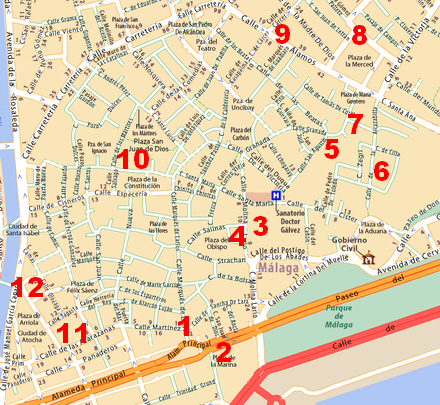 1. Calle Larios, 2. musikmuseet, 3. katedralen, 4. biskoppens bolig, 5. Picasso Museet, 6. romerske teater, 7. Bar El Pimpi, 8. Picassos fødehjem, 9. dukkemuseet, 10. Thyssen Museet, 11. ferskvaremarkedet og 12. folkemindemuseet