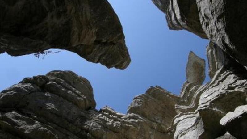 Nu gælder det bare om at følge stien, som er markeret med grøn-hvide mærker, indtil vi pludselig står nede i kløften ved Store Knud. Klippeformationerne på begge sider af kløften er stejle og smukke med helt unikke former, så det er en ren fryd.