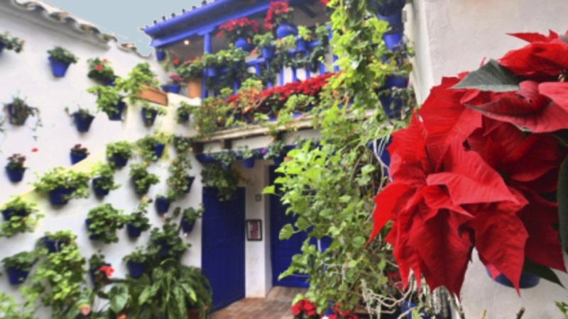 ”La Navidad en los Patios” byder på blomsterdekorerede gårdhaver med vinterens mest kendte blomster som azalea, alpeviol og julestjerner i røde, lilla og lyserøde nuancer.