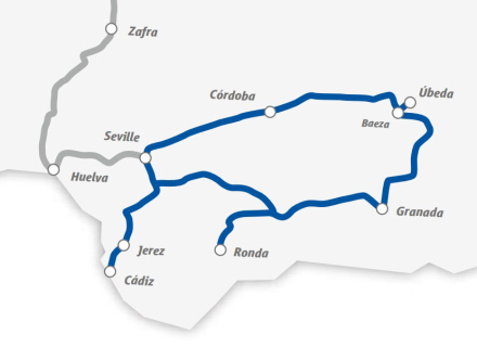 Togets rute i Andalusien starter i Sevilla og tager dig 1.300 kilometer rundt i regionen for til sidst at ende i Sevilla igen. Turen varer seks dage, og toget besøger de middelalderlige byer Cádiz, Jerez, Ronda, Granada, Baeza og Córdoba.