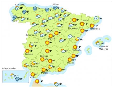 Madrid har i dag tiltagende skydække med to – ni grader, Barcelona skyet og mellem syv – 12 grader, Valencia letskyet og syv – 16 grader, og endelig Málaga letskyet og mellem ni – 15 grader.