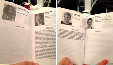 Ana Botellas tomme side i brochuren står i skarp kontrast til den norske udenrigsminister, Børge Brende, som man kan se på den modsatte side. Hans C.V. Fremstår tætskrevet og fylder næsten en hel side.