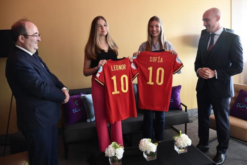 Selvfølgelig skulle prinsesserne har hver sin landsholdstrøje. Til venstre Spaniens kultur- og sportsminister, Miquel Iceta