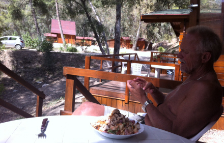 Vi valgte den sidstnævnte, hvor vi for 45 euro lejede den hyggeligste lille hytte med både udsigt og charme. Vi døbte den Saunaen, men efter en hurtig udluftning var det helt ok. Der var både køleskab, et par kogeplader, badekar og to soveværelser. Og så selvfølgelig terrassen.