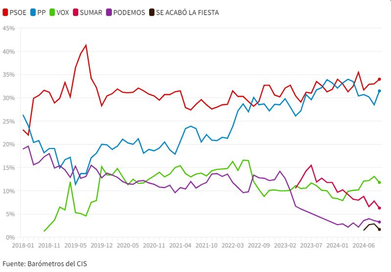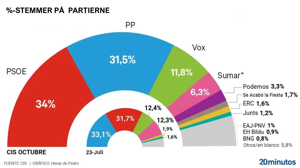 Mens PSOE og PP ville forbedre deres valgforventninger i dette konfrontationsklima, ville både Vox og Sumar miste terræn Især Sumar, PSOEs regeringspartner, som er faldet 1,5 point på en måned og med 6,3 procent registrerer den laveste støtte i sin historie, uden at det er lykkedes at stoppe den nedadgående tendens siden parlamentsvalget i 2023. Vox, som mister 1,3 point i forhold til den foregående måling, ville få et anslået stemmetal på 11,8 procent og dermed se den vækst, de havde oplevet siden februar i år, blive afbrudt. Podemos falder med tre tiendedele til 3,3 procent.