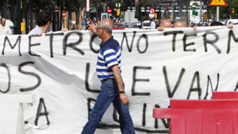 Anlægsarbejdet ved Callejones del Perchel er stort set gået i stå. Kun fem personer arbejder lige nu på at færdiggøre en strækning på 716 meter, og det fik i går indbyggere og lokale forretningsfolk til at gennemføre en protestaktion mod det strandede metrobyggeri.