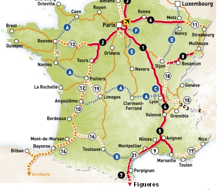 På turen fra Paris passeres Lyon, Valence, Montpelier og Perpignan
