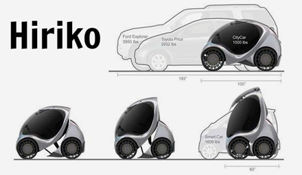 Her ses, hvor lille Hiriko er, i forhold til almindelige biler. På eksemplet vises en Ford Explorer og en Toyota Prius