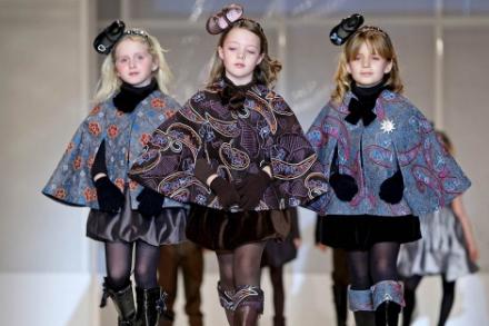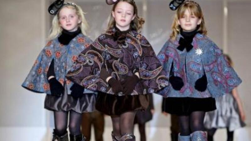 Frisuren er i top, når børnemodeller i netstrømper og høje hæle går cat-walk på modemessen FIMI i Valencia her i weekenden.