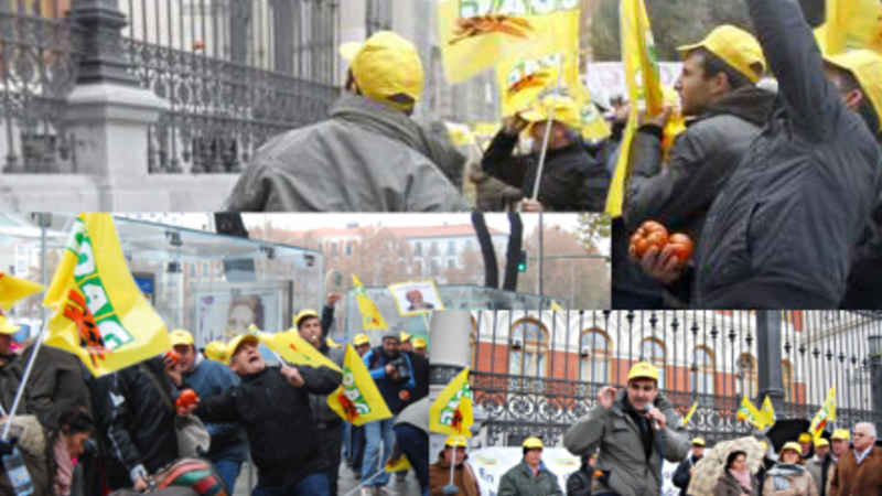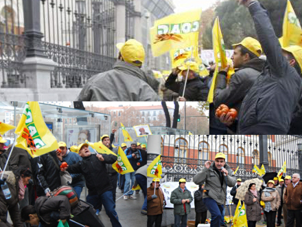Demonstranterne bar bannere, hvorpå der stod ”Cañete, contigo la agricultura se va al garete” (Cañete, med dig går landbruget ad helvede til) og råbte slagord mod den konservative landbrugsminister, Miguel Arias Cañete.